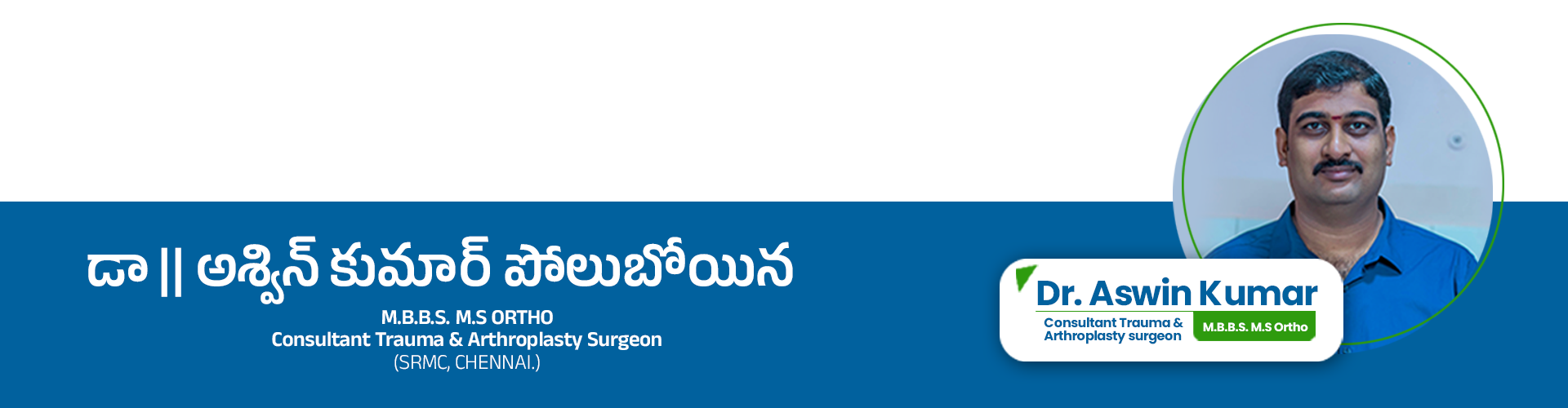 Dr. Aswin Kumar Poluboyina is a highly skilled and experienced Trauma & Arthroplasty Surgeon with a stellar academic background and over 15 years of dedicated service in the field of orthopedics. He completed his Bachelor of Medicine, Bachelor of Surgery (MBBS) and further pursued a Master’s in Orthopedics (MS Ortho) from the prestigious SMRC in Chennai.